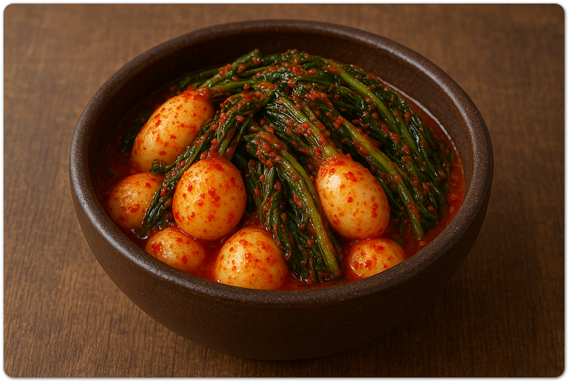 - 재료(기본): 개걸무 1단, 굵은소금, 고춧가루, 마늘, 생강, 액젓(멸치·까나리), 찹쌀풀 또는 밥, 쪽파, 양파
