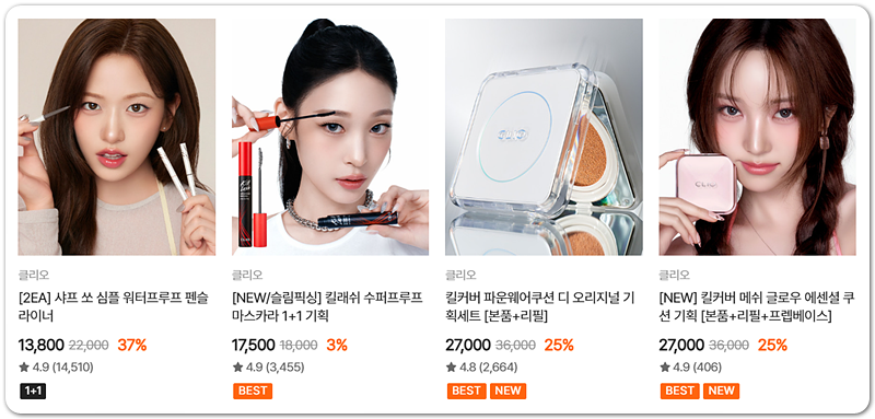 참고할 만한 인기 제품은 베이스 메이크업 중 ‘킬커버 파운웨어 쿠션’ 시리즈는 커버력·지속력 뛰어나고 자연스러운 마무리로 꾸준하게 인기리에 판매되는 제품이고요. 아이라이너·마스카라는 워터프루프·스머지프루프 기능으로 강한 지속력을 선호하는 소비자에게 인기가 많답니다.