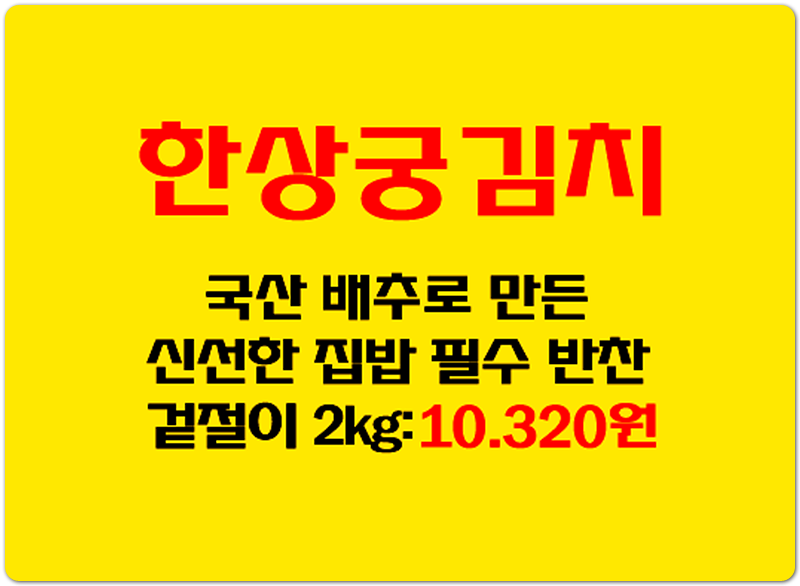 국내산 배추로 만든 한상궁김치 겉절이 2kg, 리뷰평점 4.6! 대용량 신선 겉절이로 집밥 반찬부터 선물용까지 딱 좋은 김치입니다. 가성비 좋은 가격 & 무료배송입니다.
